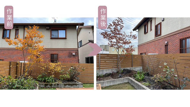 常緑低木の茂っていた枝葉がスッキリと剪定されました。